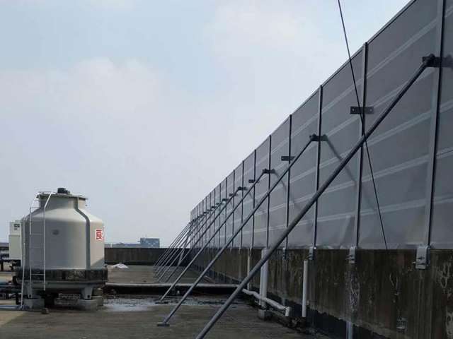 冷卻塔聲屏障采用混合型聲屏障,頂部為吸聲單元,以下部分為隔聲單元。合理確定聲屏障的長度和高度后,可獲得10-25dB(A)的降噪量。